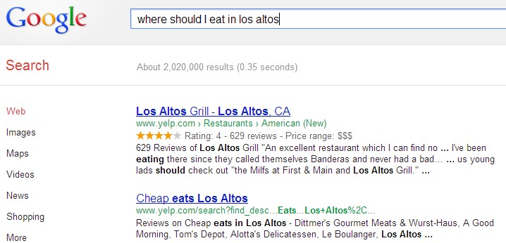 As a consumer, I have totally mastered search, and you probably have too. You Google “Where should I eat in Los Altos” and you are directed to a results page that lists the top spots based on community reviews from Yelp and Urban Spoon. Likewise, you can get similar results on Wikipedia, digging into every topic imaginable.