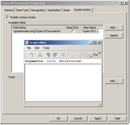 When standard capabilities or functions just aren’t enough, or if your business process dictates customization, there are options to incorporate custom scripts.  User scripts are custom scripting rule triggered by the user when viewing a field during field verification or in the document editor. The script is triggered by clicking to the right of the field value.  To make the creation or modification of the scripts simple, there is a script editor available directly in the data capture configuration interface.