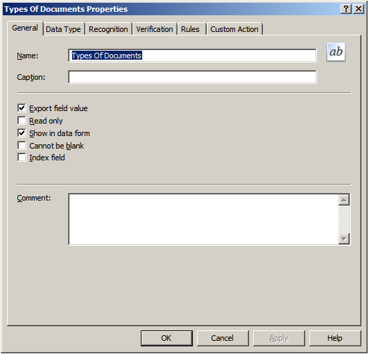 From the General tab in your data capture application you can provide a useful field name for each individual field you wish to extract data. This configuration tab will allow you to decide such basic functionality such as if the field is Read Only or Cannot be blank.  Also, you can decide whether to Export field value because sometimes you might wish to recognize some information such as a line item amount but do not wish to export the line item, just overall total amount.  The most commonly used functionality is enabled by default.