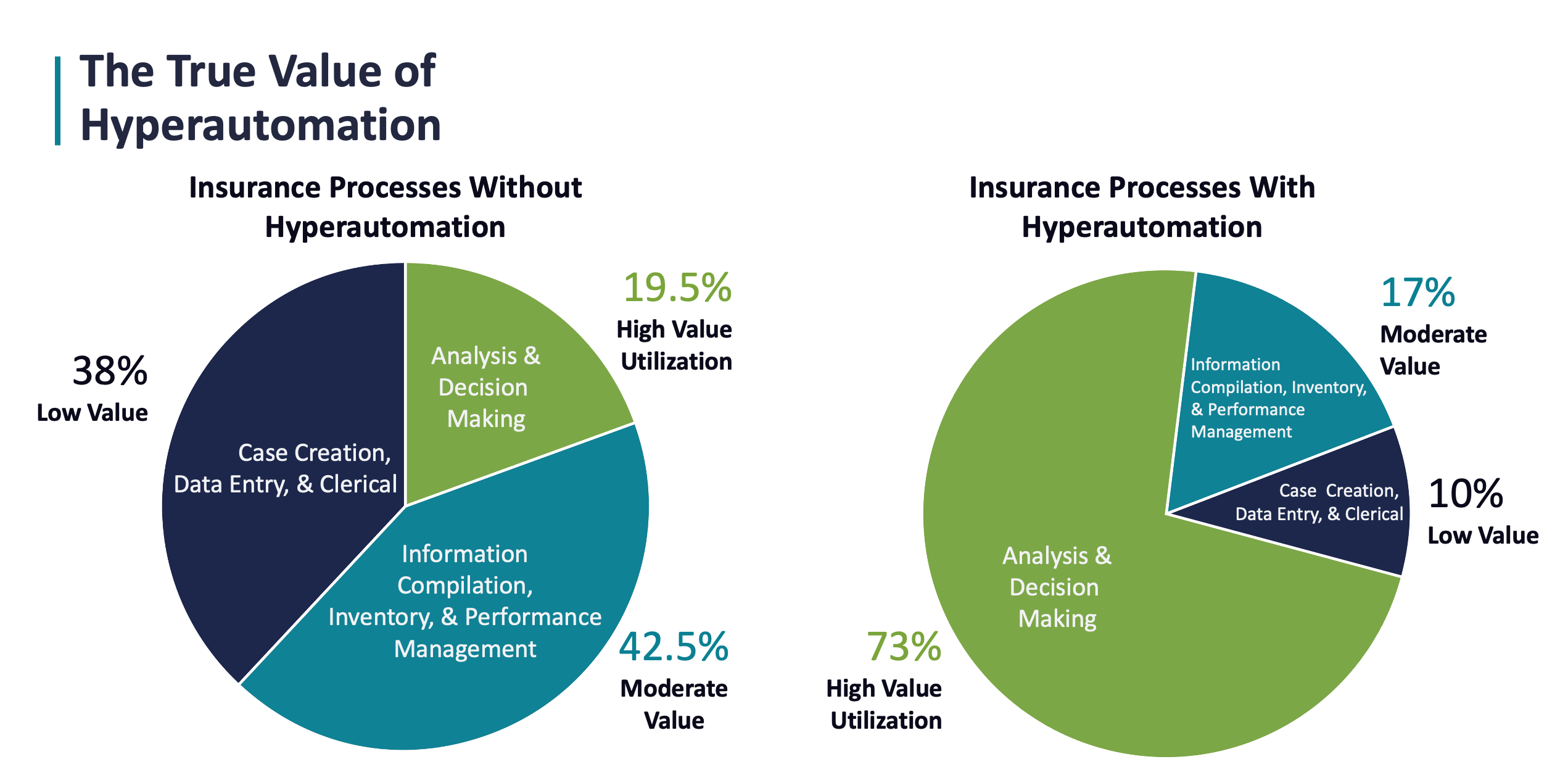 Why is Hyperautomation important? It can be very hard for companies to succeed when faced with high inflation, the great resignation, fear, instability, and competition. The great resignation is here. There are 1.9 jobs per employee right now. According to a recent Gallup poll, “State of the Global Workplace Gallup Report, only 31% of employees in the USA and Canada are actively engaged at work (i.e., Psychological owners that drive performance and innovation); 53% of employees are not engaged (i.e., unattached, no energy or passion); and 17% of your employees are actively disengaged (i.e., resentful, unhappy and undermining engaged employees). Hyperautomation helps companies become disruptive in their prospective market, have happier employees, produce better margins, engage more customers, and have less risk. Companies that hyperautomate have employees that spend the majority of their time on analysis and decision making. Companies without hyperautomation see their employees spend the majority of their time on case creation, data entry, clerical tasks, information compilation, inventory, and performance management. Only a very small percentage spend quality time on analysis and decision making.